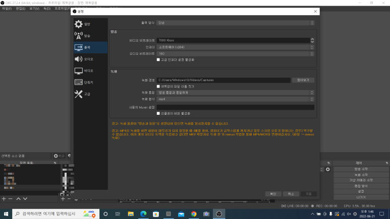 OBS는 실시간 스트리밍 프로그램이기 때문에 업로드 속도가 매우 중요합니다.