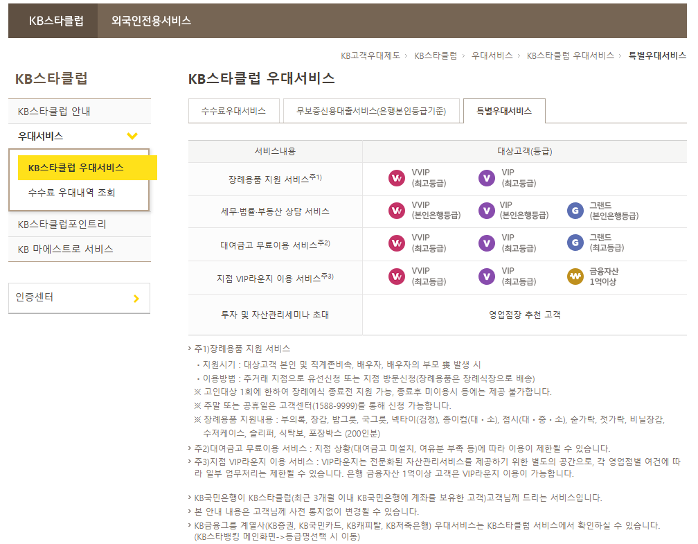 특별우대서비스는 KB스타클럽 고객 중 VVIP, VIP, 그랜드 등급 이상 고객을 대상으로 제공되는 혜택으로, 일상생활에서 꼭 필요한 서비스를 중심으로 구성되어 있습니다.