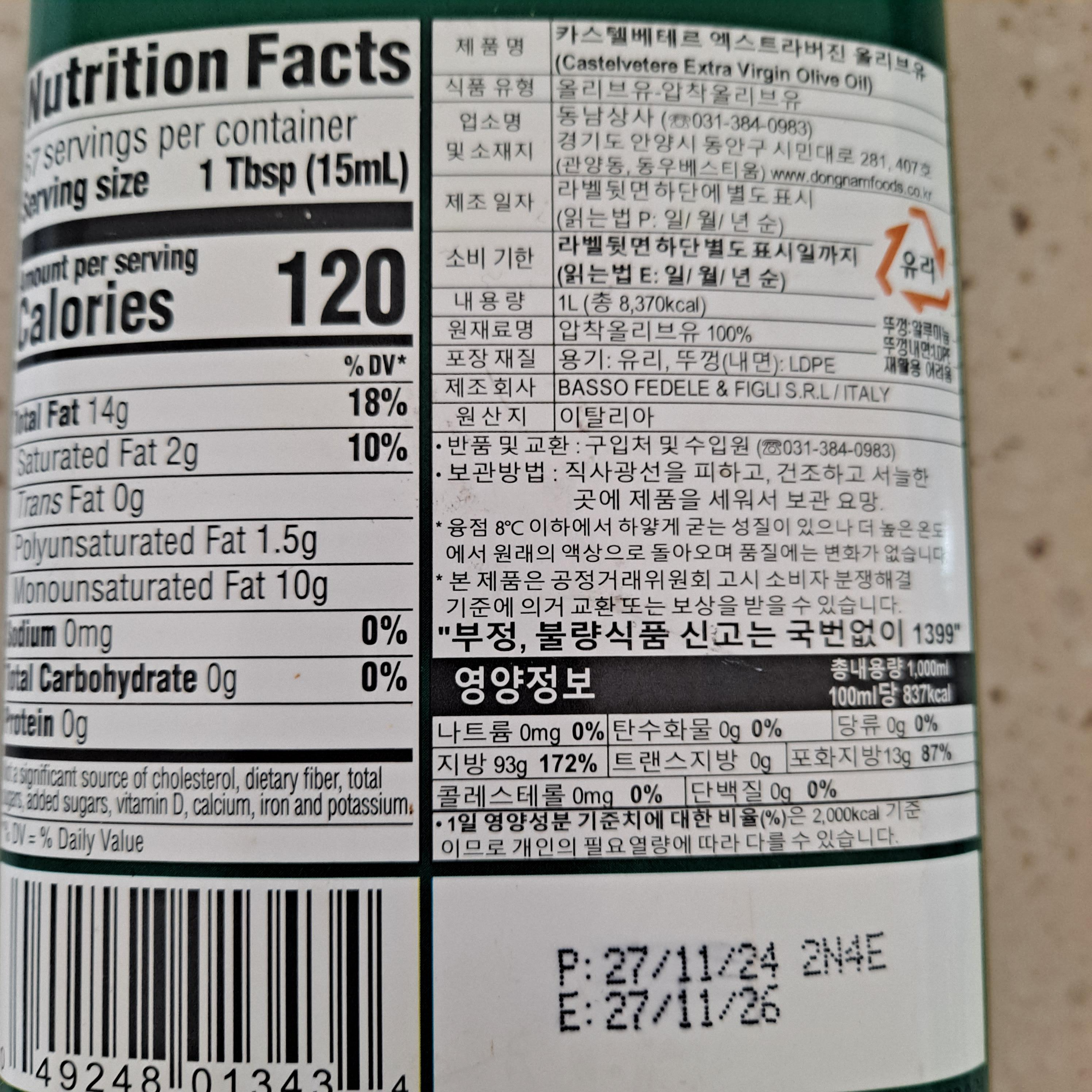 올리브오일은 과일즙처럼 생과일 성분이므로 수확 후 1년 내 제품을 고르는 것이 신선도 면에서 유리합니다.