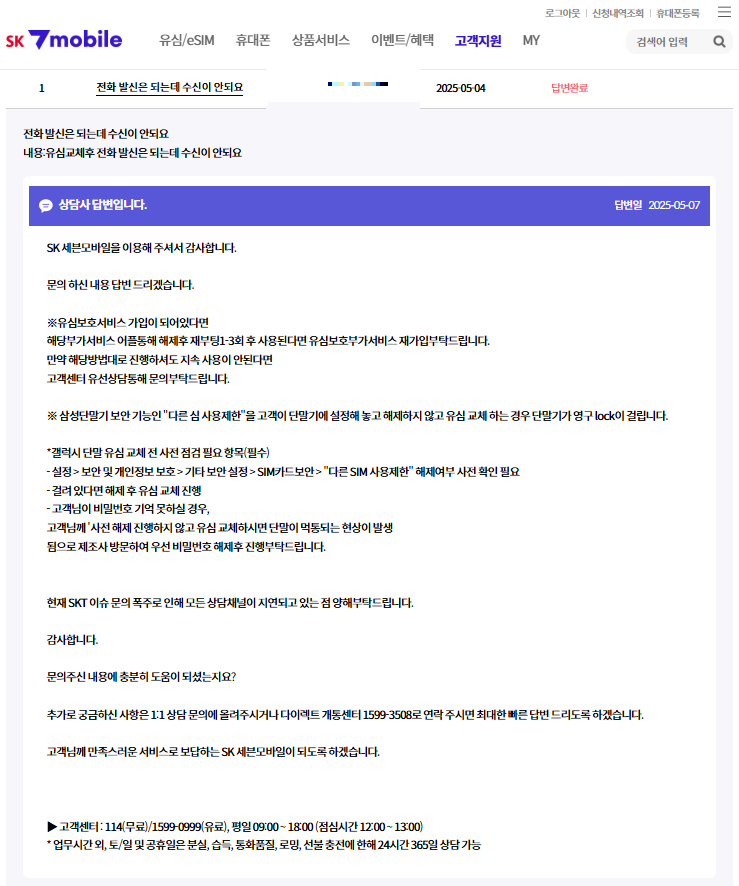 그후 시스템 보완으로 앱과 홈페이지의 1:1 고객상담에 을 통해 유심교체요청(유심 구매완료 고객) 메뉴가 생성이 되어 빠르게 유심교체가 가능해졌습니다.
