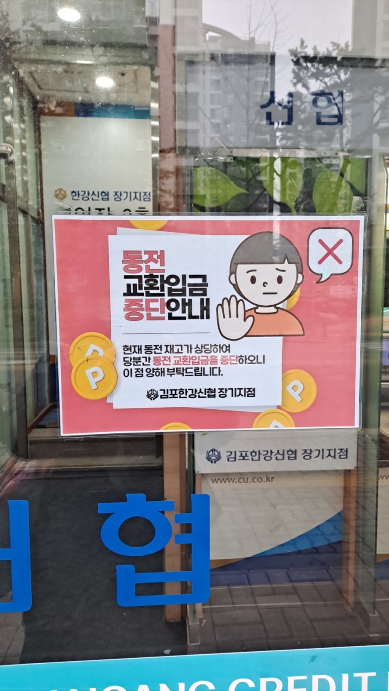 그런데 최근 장기동 김포한강신협 장기지점 앞을 지나다 보니, 동전 보유량이 많아 당분간 동전 교환 입금이 중단되었다는 안내문이 붙어있는 것을 보았습니다.