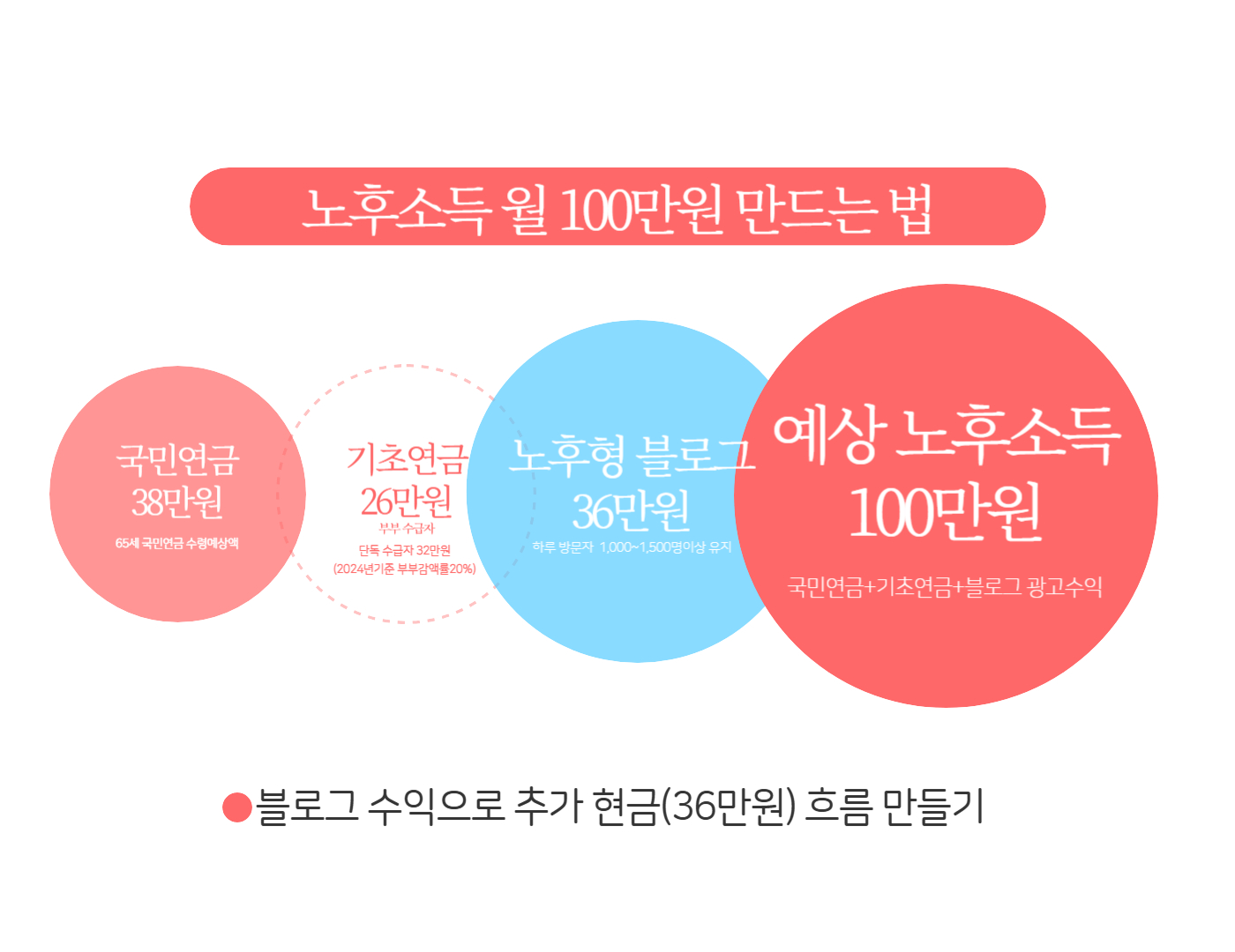 국민연금만으로는 부족하다고 느껴질 수 있지만, 기초연금과 블로그 수익을 더하면 월 100만 원의 안정적인 노후 소득 구조를 충분히 마련할 수 있습니다.