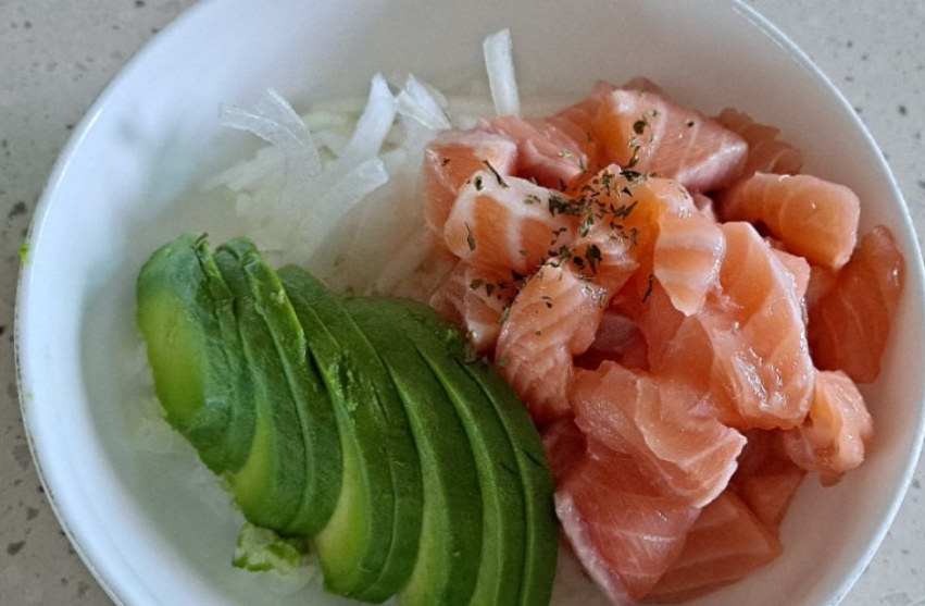 잘 익은 아보카도를 썰어 연어, 간장, 맛술, 물, 올리고당, 후추, 양파슬라이스 소스와 함께 덮밥으로 즐기면 맛있는 한 끼가 완성됩니다.