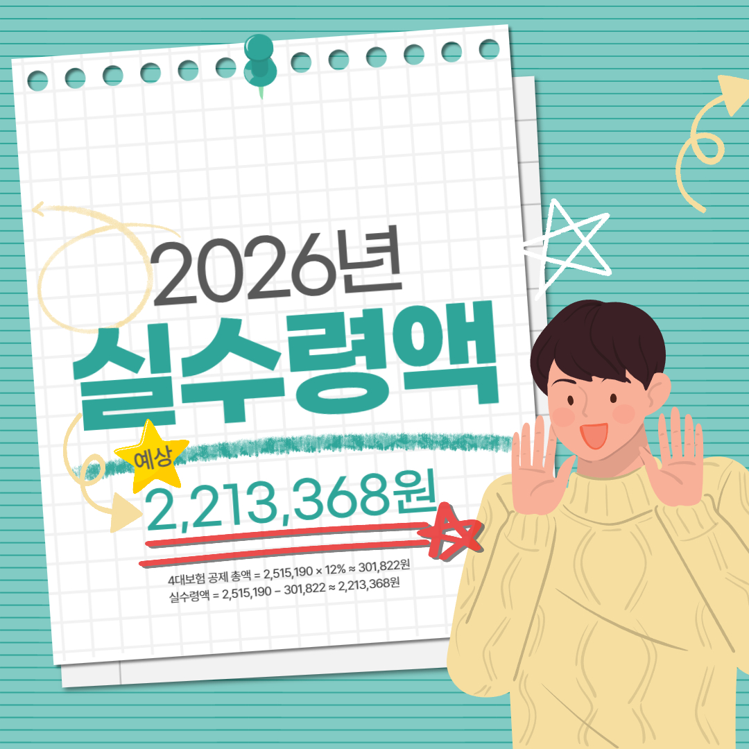 2026년 최저시급 10,320원 시급 기준으로 주휴수당 포함 시 세전 월급은 약 2,515,000원, 실수령액은 공제 후 약 2,213,000원 수준이 됩니다.