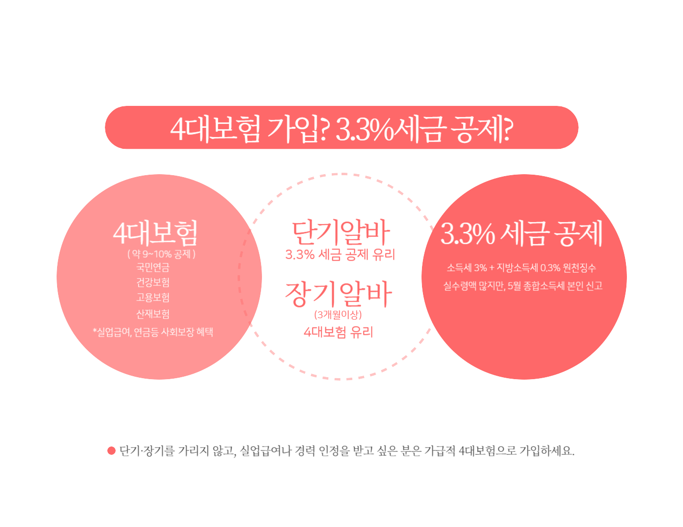 1개월 미만의 단기 알바라면 3.3% 공제가 실용적이고, 3개월 이상 또는 복지 혜택이 필요한 장기 근무라면 4대보험 가입이 훨씬 유리합니다.