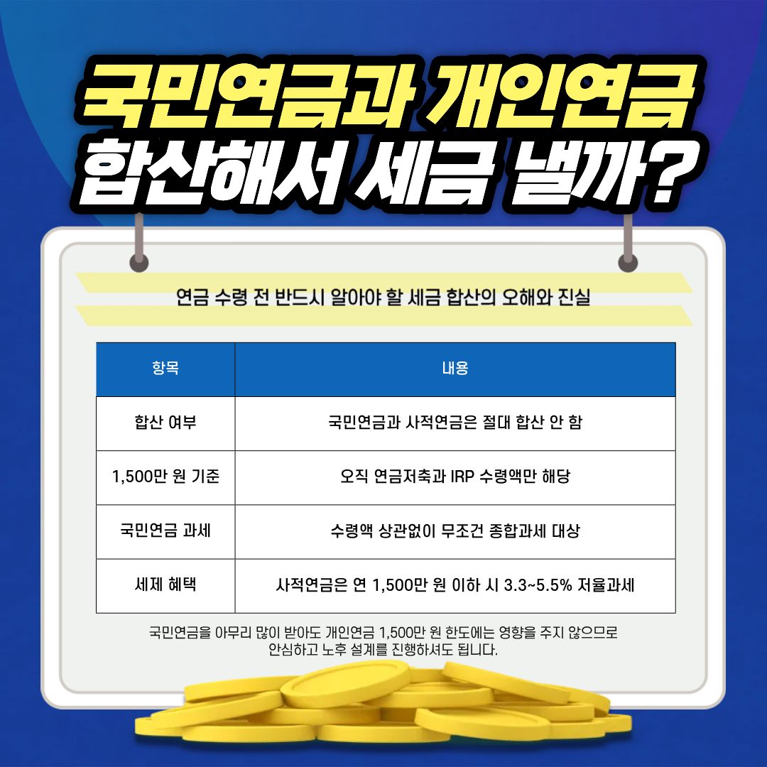 결론부터 말씀드리면 국민연금과 사적연금은 세법상 절대 합산하지 않으며, 사적연금은 연간 1500만 원 이하일 경우 낮은 세율로 분리과세가 가능합니다.