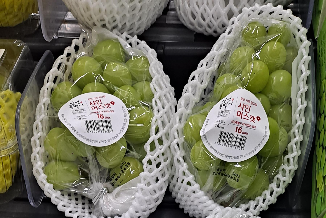 샤인머스캣은 껍질째 먹는 청포도로, 당도가 높고 향이 강해 프리미엄 과일로 분류됩니다.