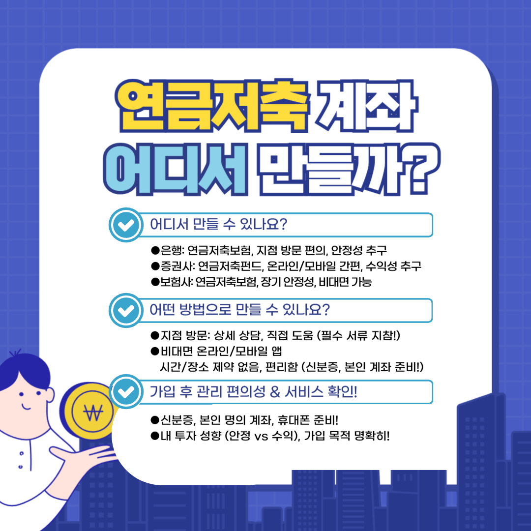 많은 분이 연금저축의 중요성은 알고 계시지만, 막상 계좌를 만들려고 하면 '어디서 해야 할까?', '어떻게 만들어야 할까?', '복잡하지는 않을까?' 하는 고민에 망설이곤 하는데요.