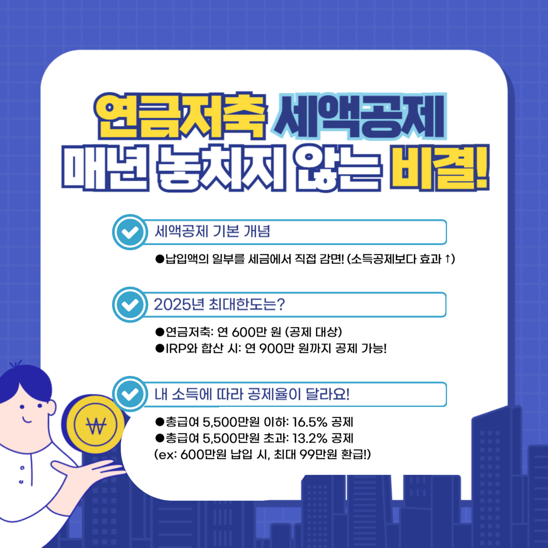 매년 연말정산 환급금을 최대로 받고 싶으신가요? 연금저축 세액공제의 개념부터 2025년 최대한도, 납입 한도를 꽉 채우는 스마트한 전략, IRP와 연계하는 시너지 효과, 그리고 납입 기간 중 유의할 점까지, 연금저축으로 매년 절세하는 모든 노하우를 알려드립니다.