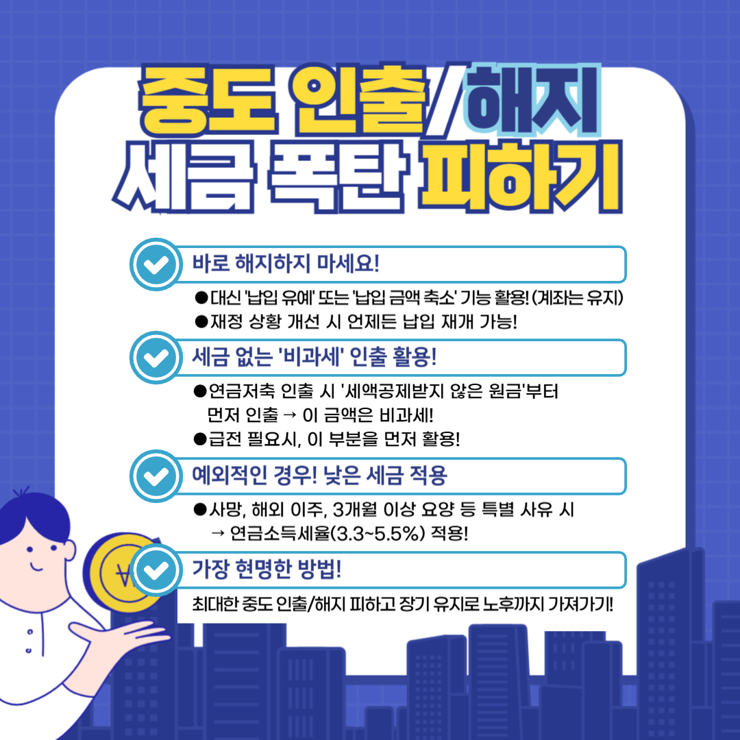 중도 인출이나 해지로 인한 불이익은 잠시의 어려움을 위해 노후 전체를 흔들 수 있습니다.
