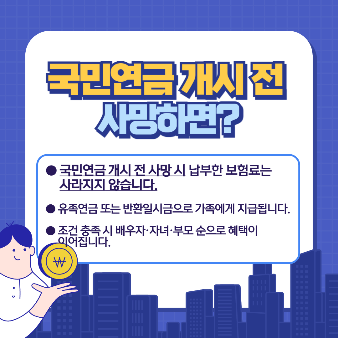 국민연금 개시 전에 불행히 사망하게 되더라도 그동안 납부한 연금이 사라지는 것은 아닙니다.
