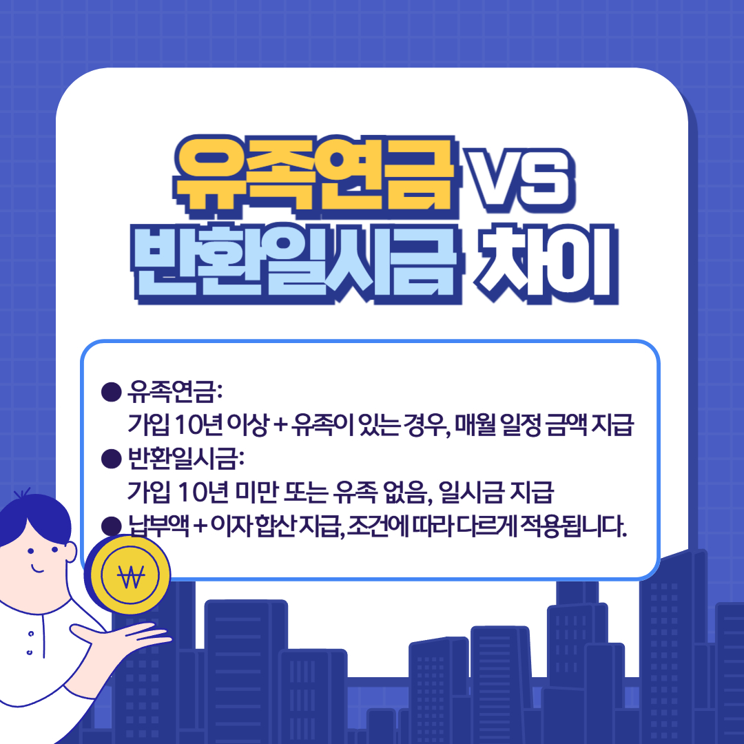 가입 기간, 납부 개월 수, 유족의 연령과 관계 등을 종합적으로 고려해 유족연금 또는 반환일시금 중 하나가 적용됩니다.