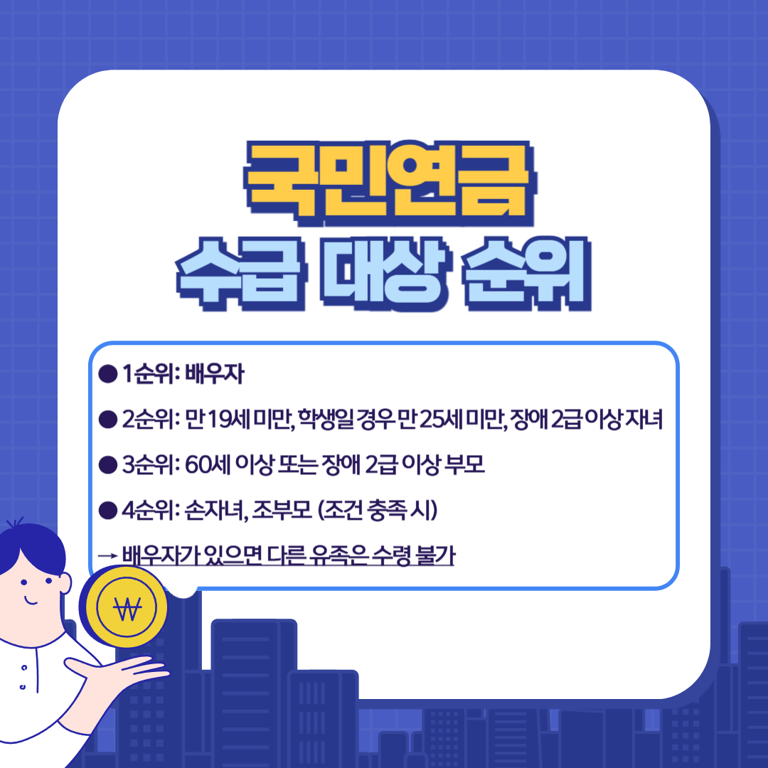 유족연금은 법정 순위에 따라 지급되며, 가장 먼저 배우자가 수급 대상이 됩니다.