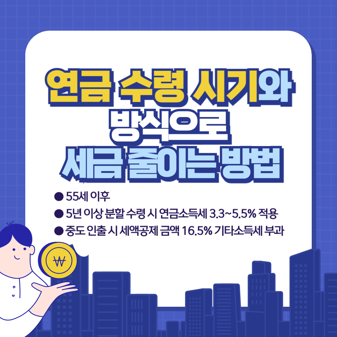 연금 수령 조건(만 55세 이상, 5년 이상 유지 등)을 갖춘 후 연금 형태로 수령하면 3.3~5.5%의 연금소득세가 적용되어 절세 효과가 큽니다.