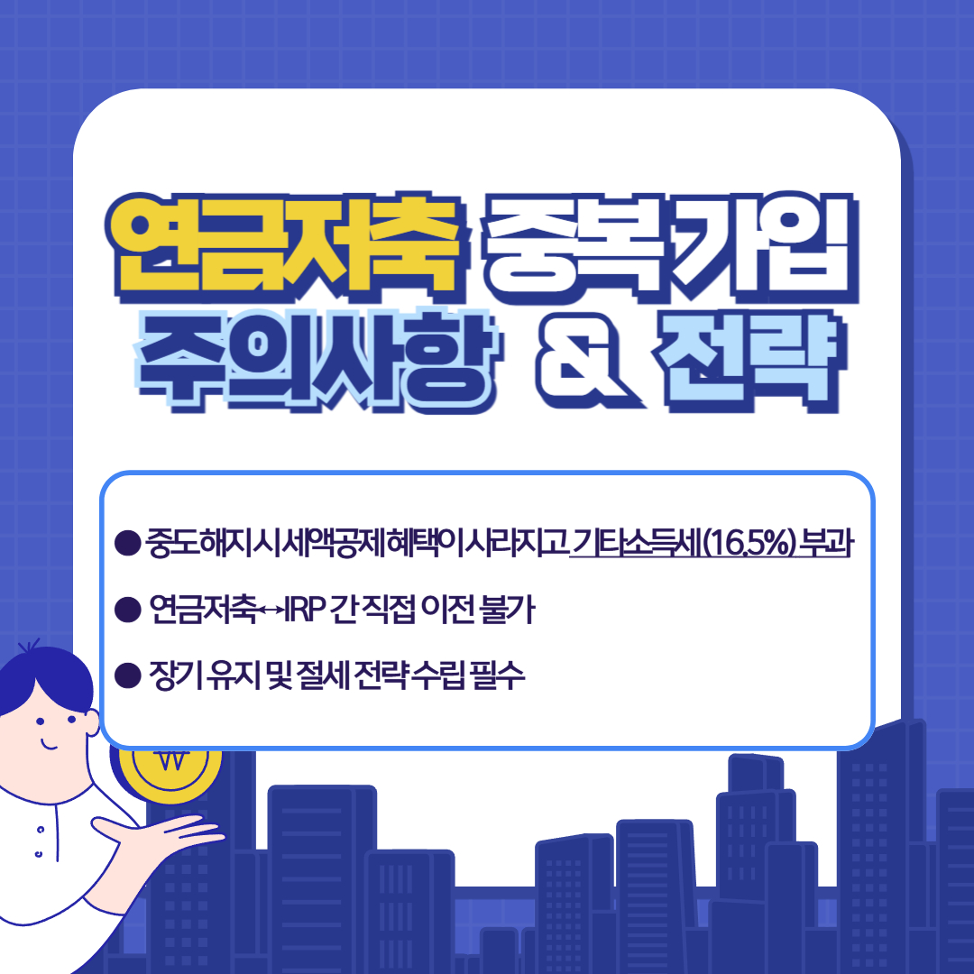 연금저축과 개인형IRP는 중복 가입이 가능하며, 절세 효과와 노후 대비라는 두 마리 토끼를 잡을 수 있는 강력한 금융 도구라고 할 수 있습니다.