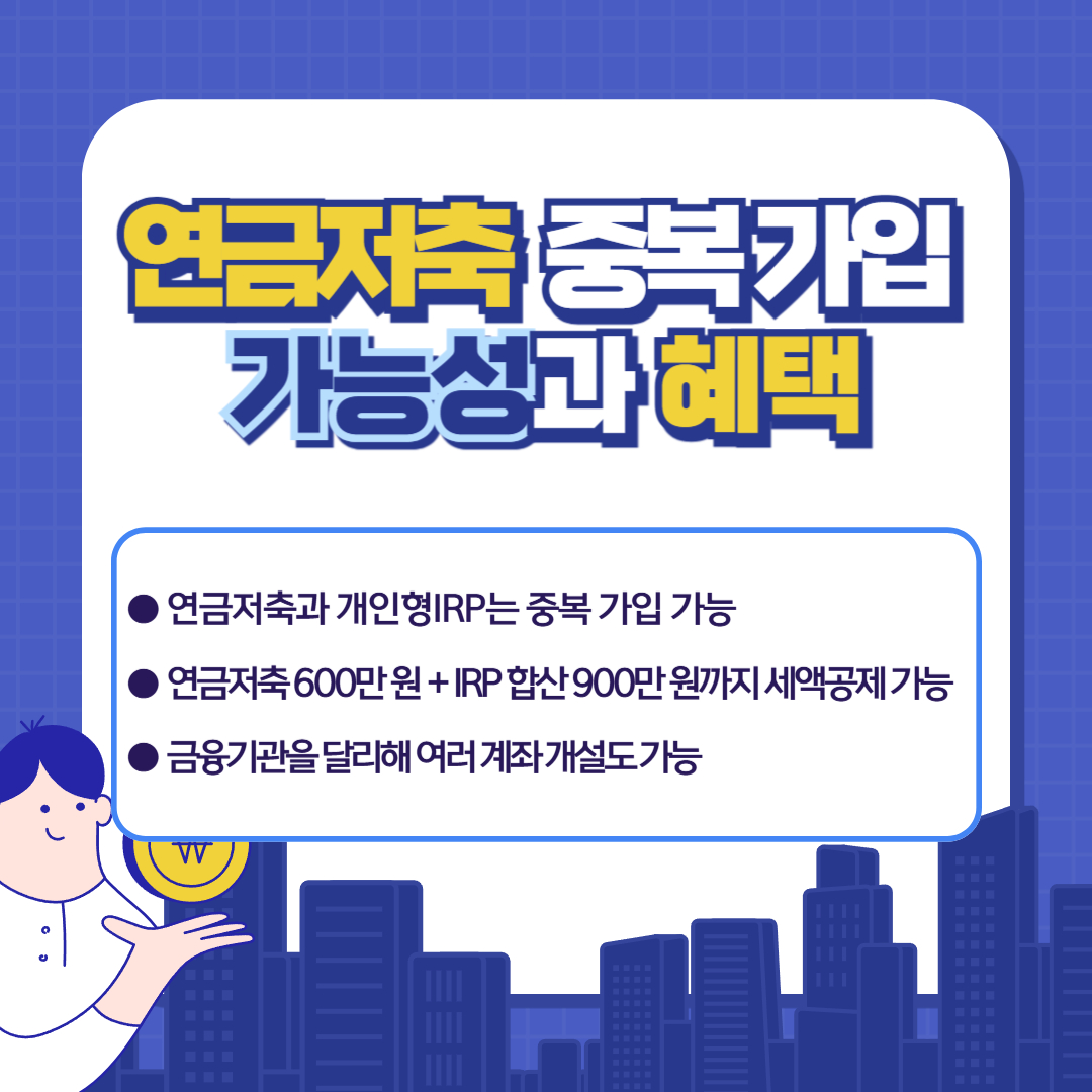 연금저축계좌와 개인형IRP는 중복 가입이 가능하며, 세액공제를 합산해 최대 900만 원까지 절세 혜택을 누릴 수 있습니다.