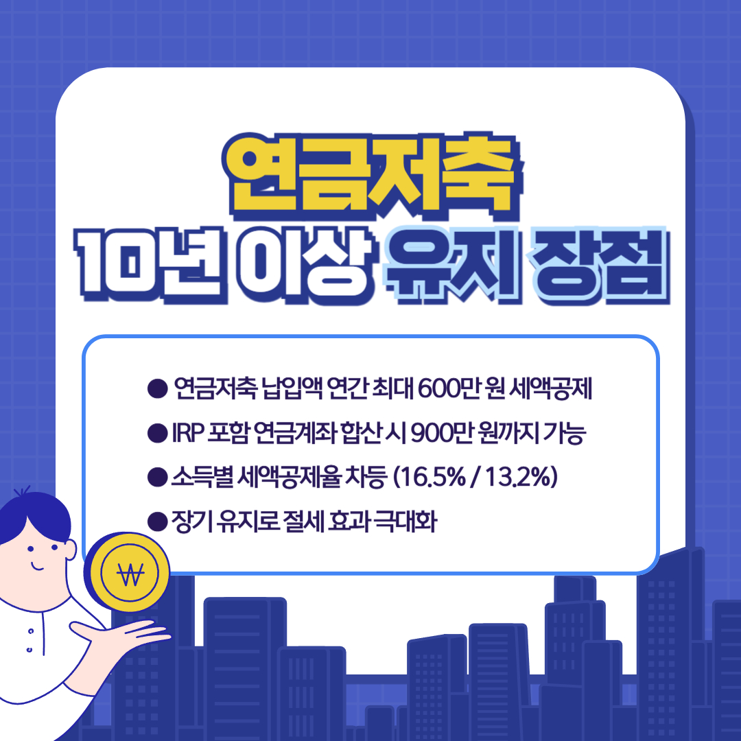세액공제 효과 극대화, 복리 수익, 세금 절감 등 연금저축을 10년 이상 유지할 때의 장점을 정리했습니다.