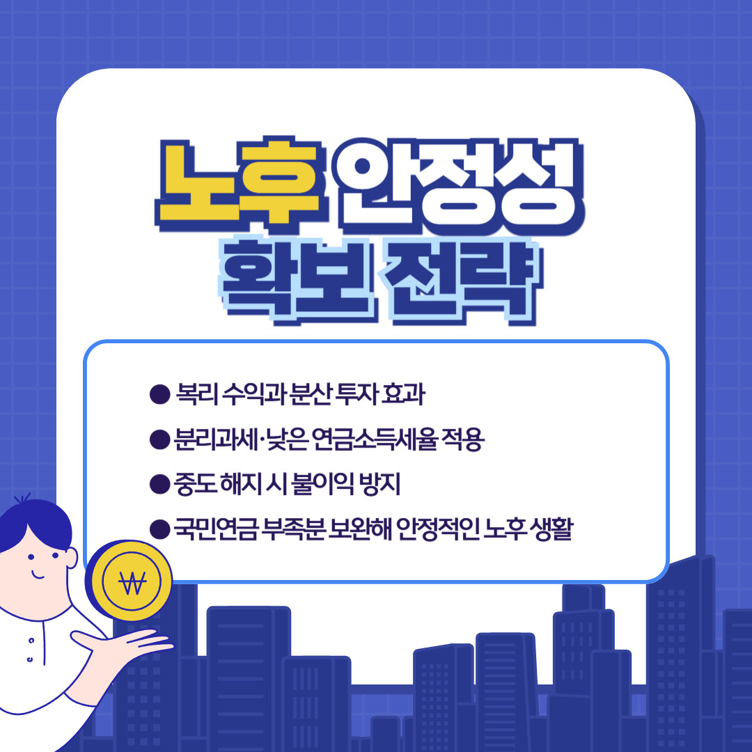 노후 보장국민연금 보완국민연금 부족분을 보충, 생활 안정성 강화