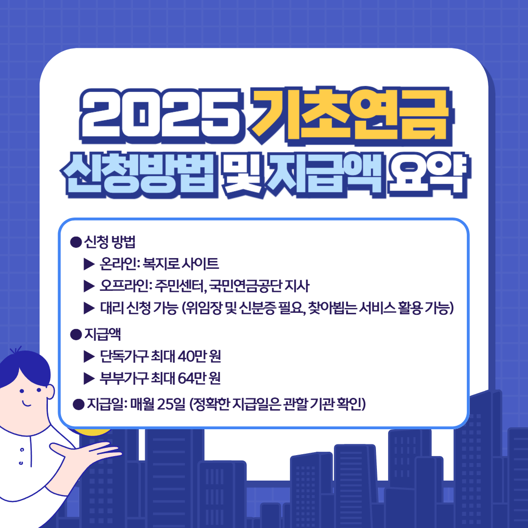 2025년 기준 만 65세 이상 어르신의 기초연금 신청 자격, 신청 방법, 지급액, 국민연금과의 관계 등 최신 정보를 자세히 안내합니다.