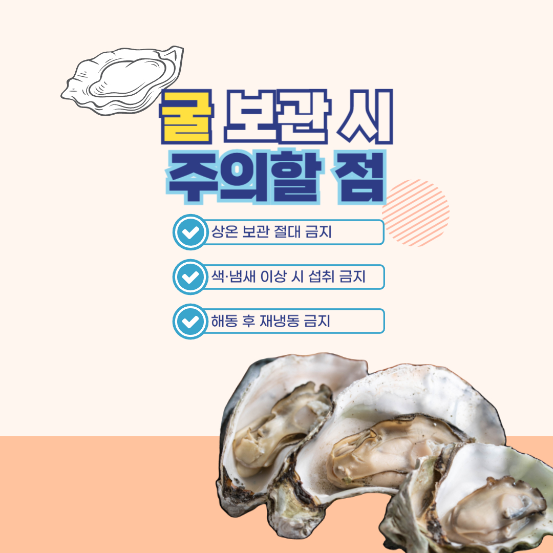 | 껍데기 굴 | 젖은 천 덮어 냉장 보관 | 4~5일 | 껍질 벌어지면 섭취하지 말 것 |