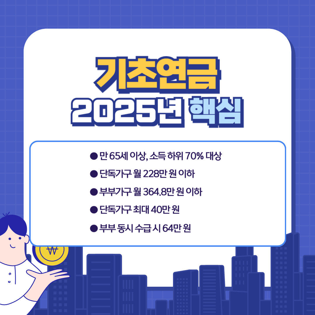 2025년 기초연금 수급 기준과 소득인정액(단독 228만 원, 부부 364.8만 원)을 정리했습니다.