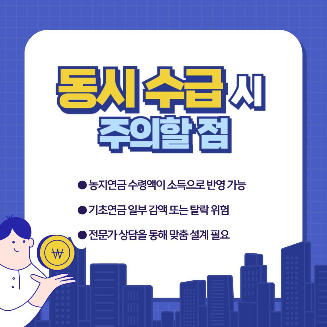 특히 농촌에 거주하면서 땅을 소유하고 계신 분들은 기초연금과 농지연금을 동시에 받을 수 있는지 많이 물어보십니다.