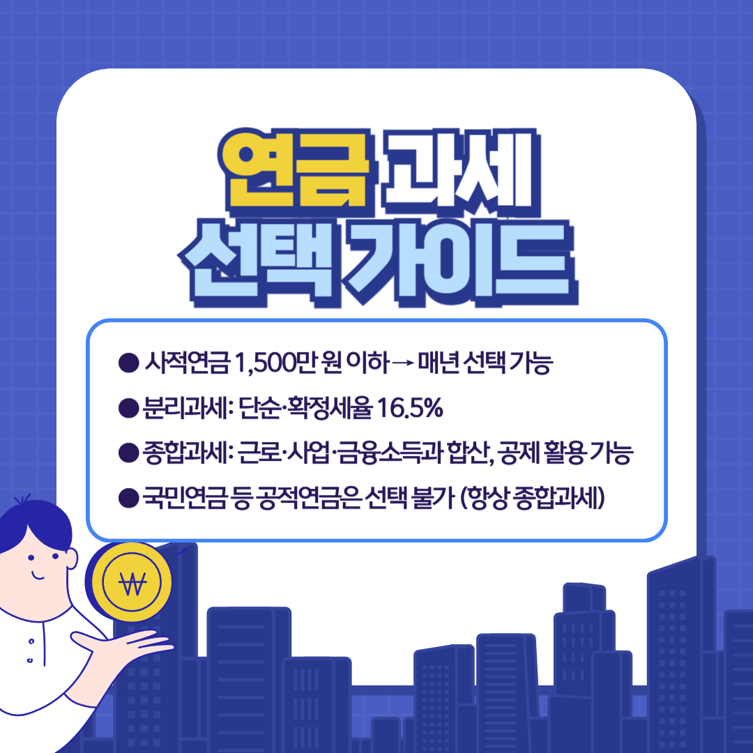 ● 사적연금: 연금저축, 퇴직연금, 개인형 IRP 등 → 연 1,500만 원 이하일 때 선택적 분리과세 가능 / 초과 시 무조건 종합과세