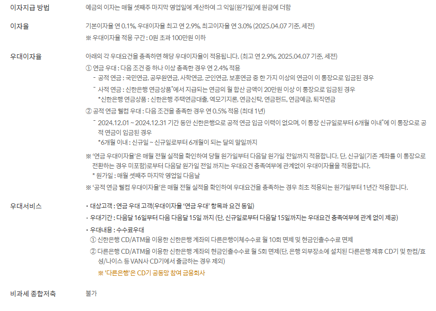 신한은행 역시 우대금리 혜택 범위는 잔액 한도 내에서 차등 적용되며,우대조건 충족 여부에 따라 월별 금리 변동이 있을 수 있습니다.
