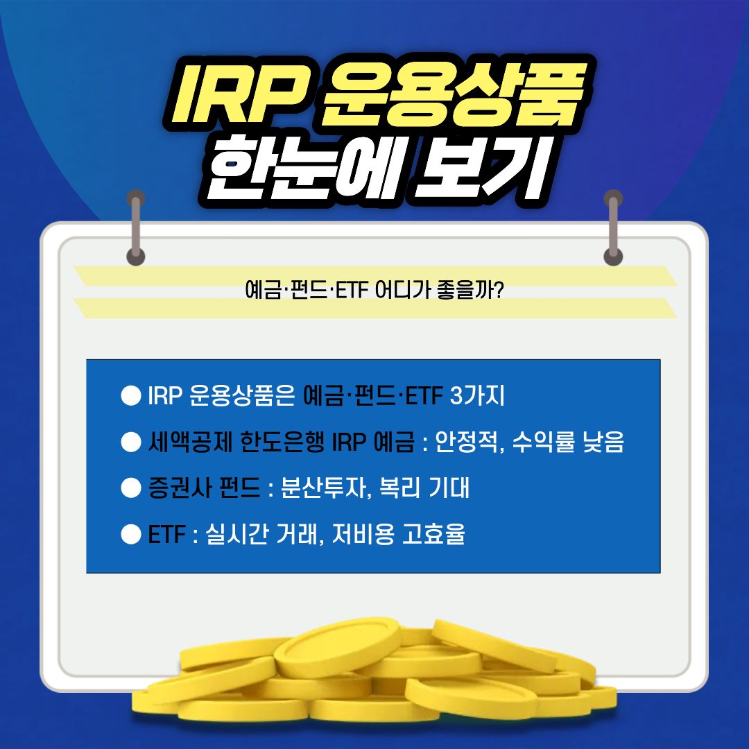 IRP 운용상품은 예금, 펀드, ETF 등으로 나뉘며 각각의 장단점이 다릅니다.