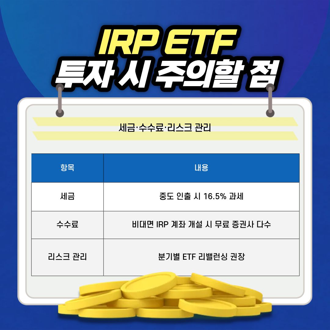IRP 계좌는 중도 인출 시 16.5% 기타소득세가 부과되므로, 단기 매매보다는 장기적인 자산 운용을 목표로 해야 합니다.