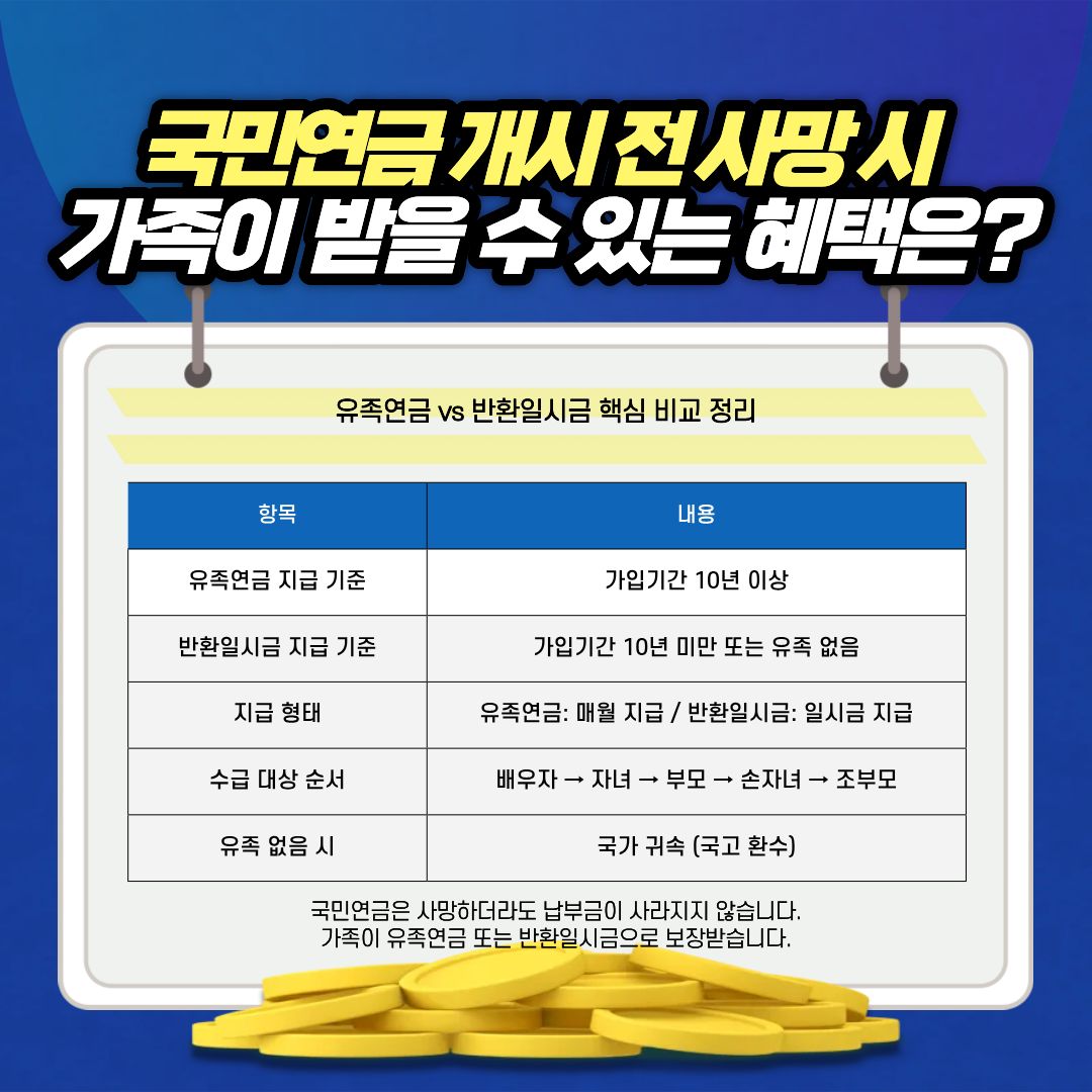 이럴 때 적용되는 제도가 바로 유족연금과 반환일시금입니다.