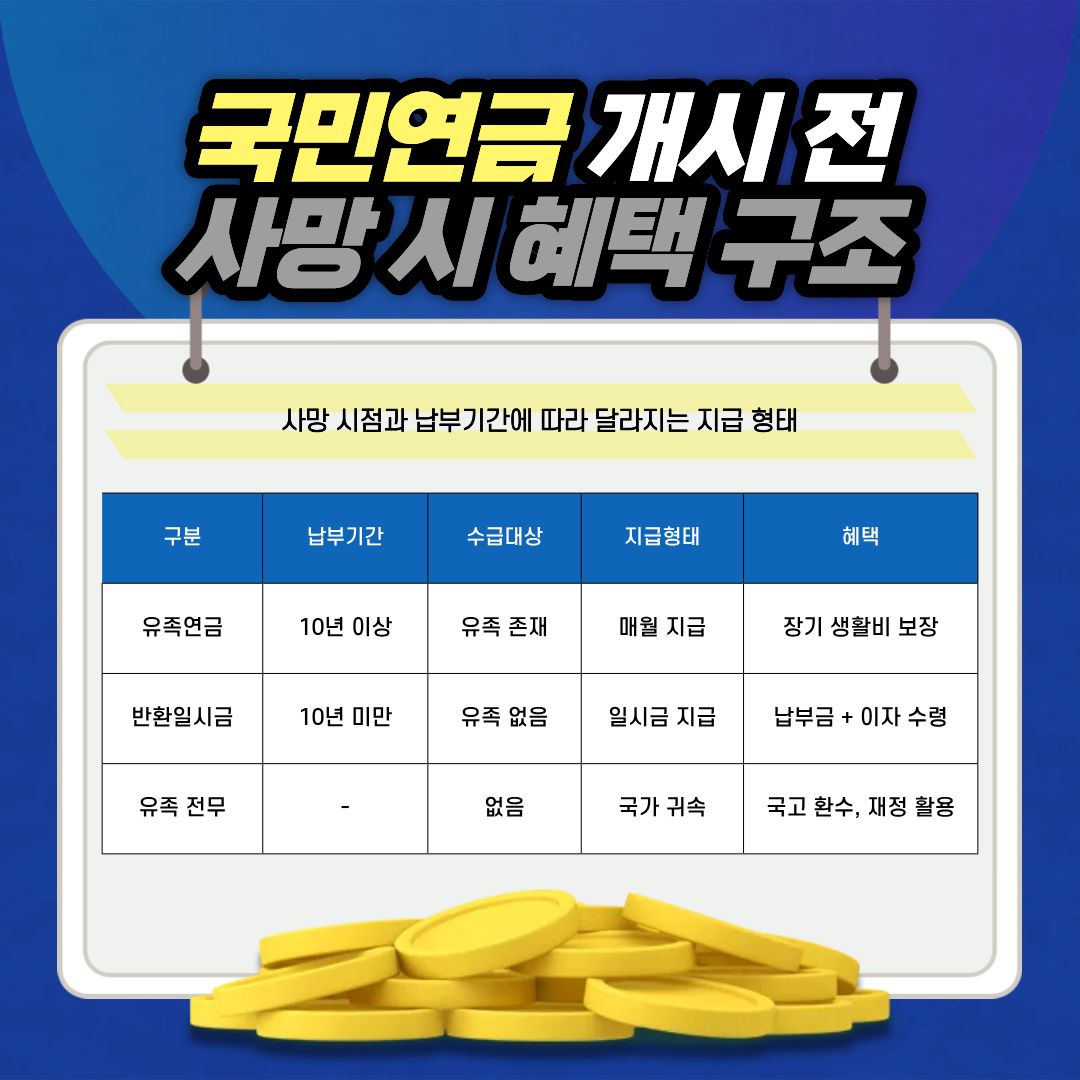 국민연금 개시 전 사망 시 적용되는 제도는 아래와 같이 구분됩니다.