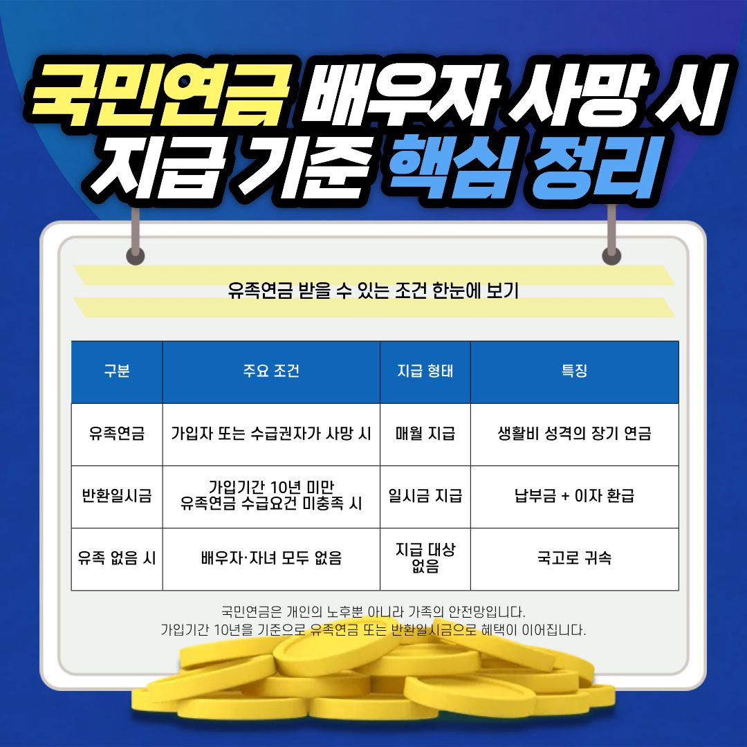 | 반환일시금 | 유족연금 수급요건 불충족 시 (주로 10년 미만 납부) | 배우자 또는 자녀 | 일시금 지급 | 납부금 + 이자 환급 |