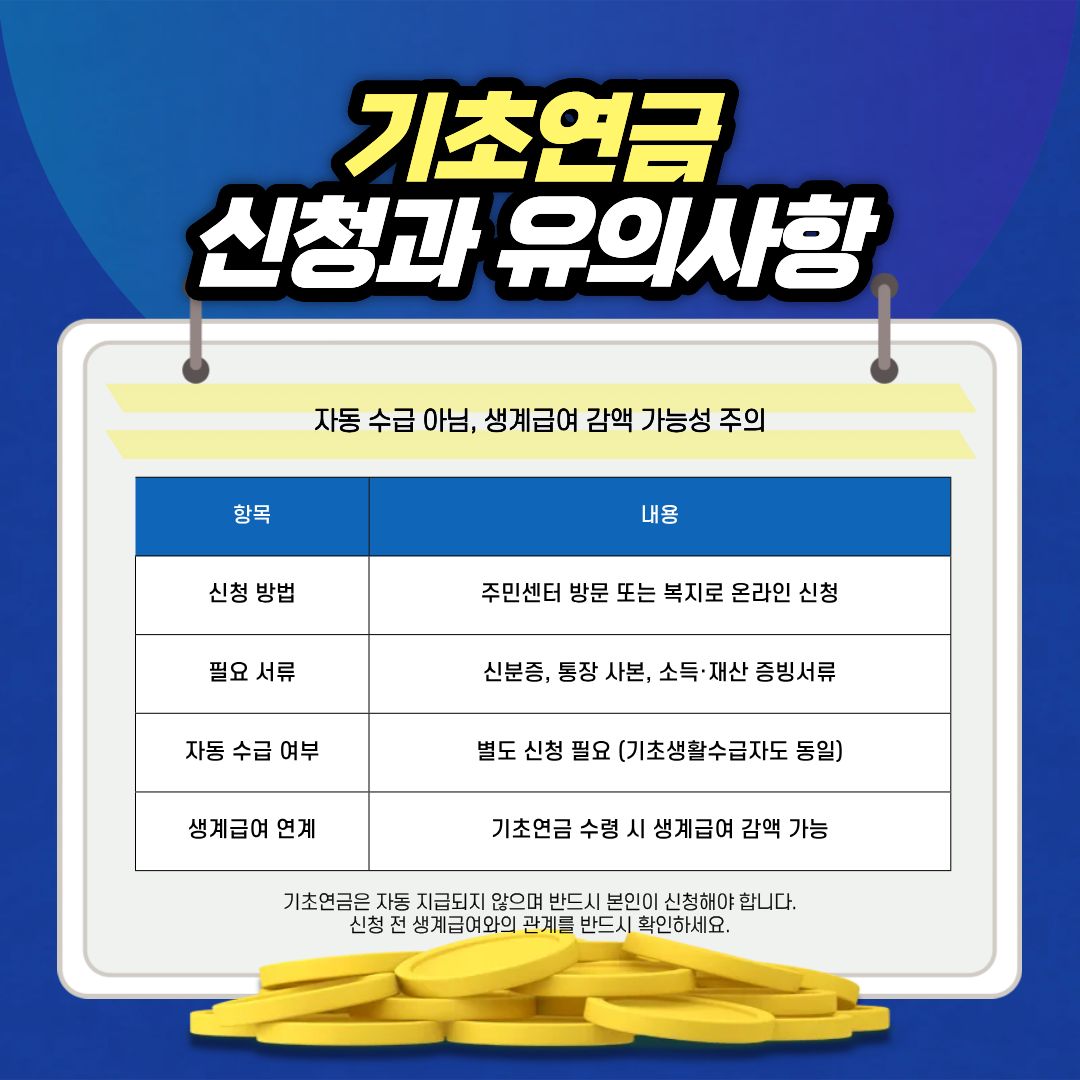 기초생활수급자이더라도 2025년 기준 선정기준액을 충족하면 기초연금을 추가로 받을 수 있다는 점은 매우 중요한 정보입니다.