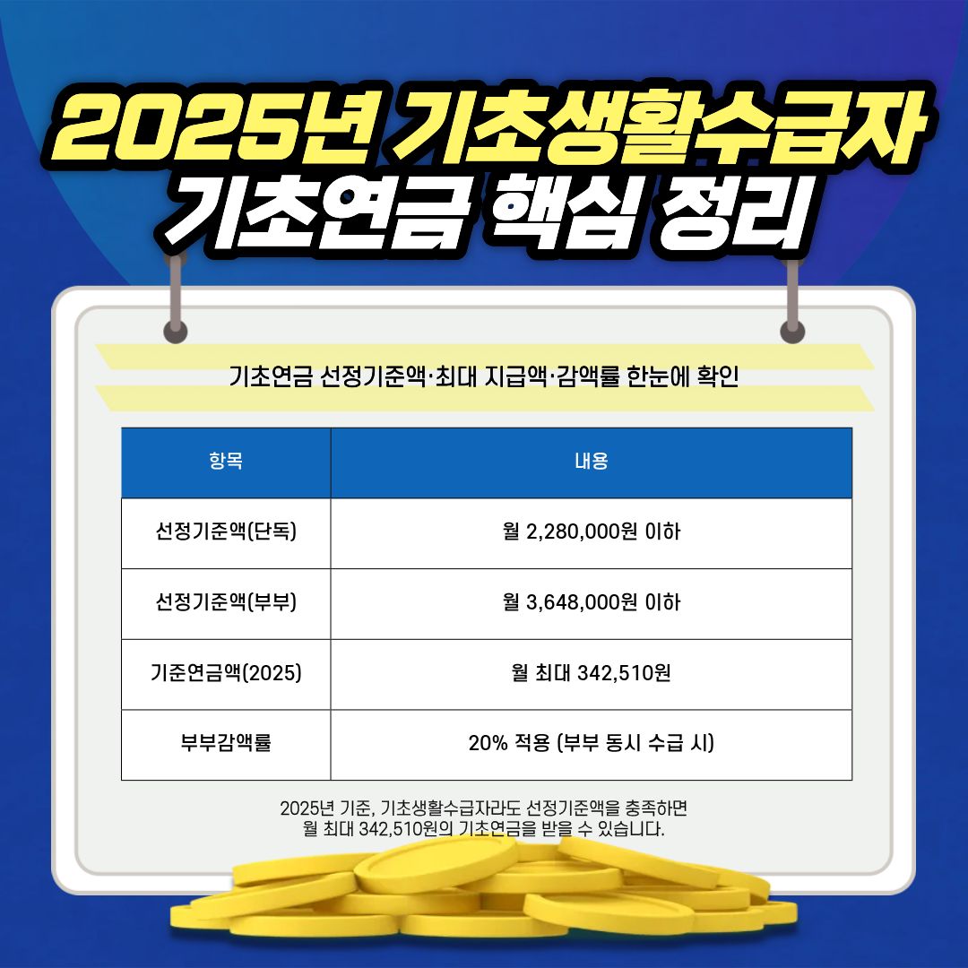 2025년 기초연금 선정기준액과 최대 연금액, 부부감액, 소득인정액 계산 방식까지 한눈에 정리했습니다.올해 변경된 기준과 수급자 구제 절차, 금융 우대혜택까지 함께 알아보세요. 2025년 1인 가