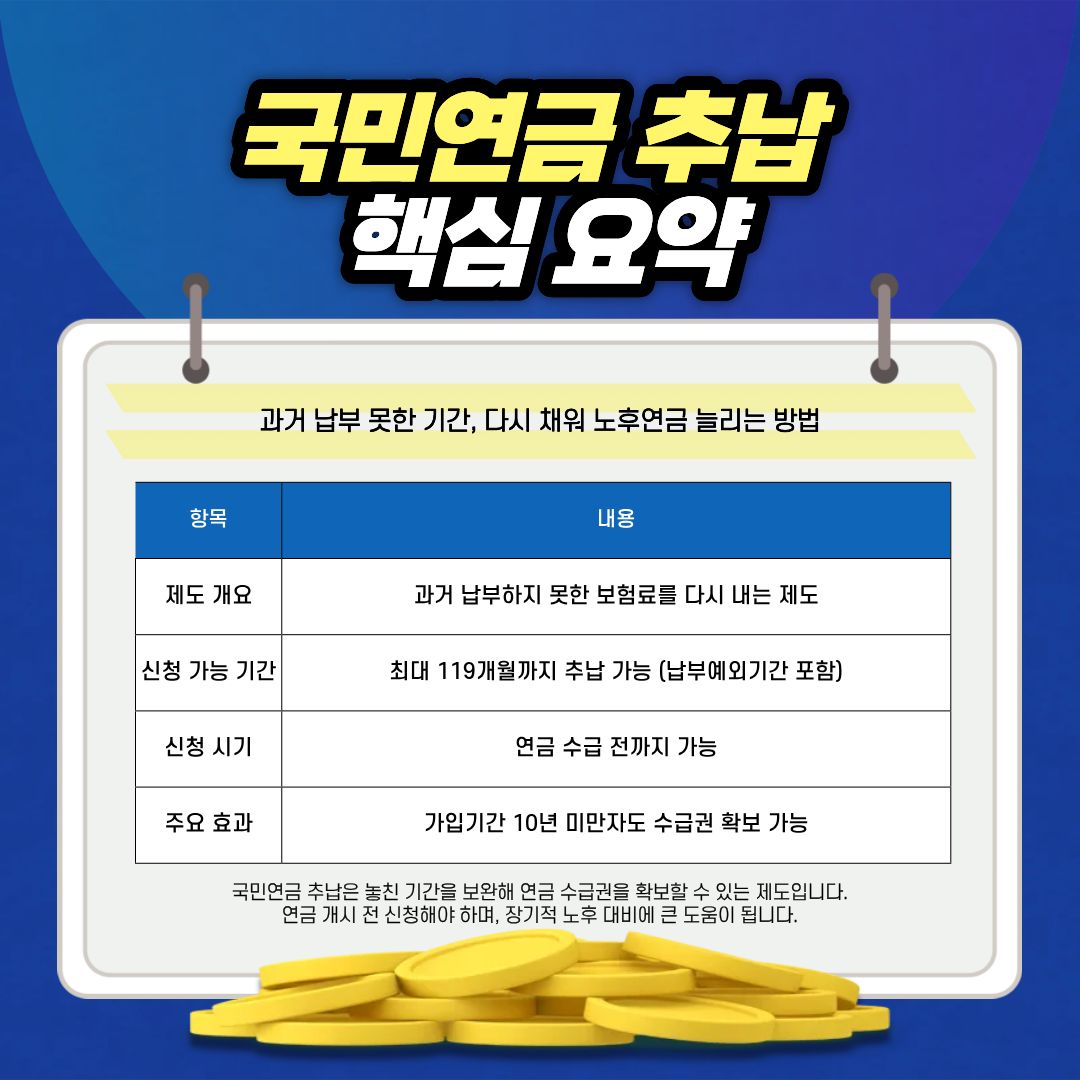 국민연금 추납은 과거 납부하지 못한 기간을 다시 채워 연금 수급 자격과 수령액을 동시에 높이는 제도입니다.
