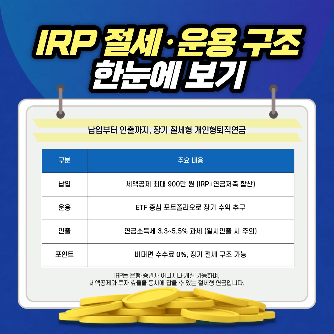 2025년 IRP 수수료 0% 혜택 증권사부터 ETF 투자전략, 수익률 관리, 세금 구조, 인출 시 절세 방법까지 정리했습니다.IRP 계좌 하나로 세금 절감과 노후 대비를 동시에 실현하세요. IRP(개인형퇴직연금
