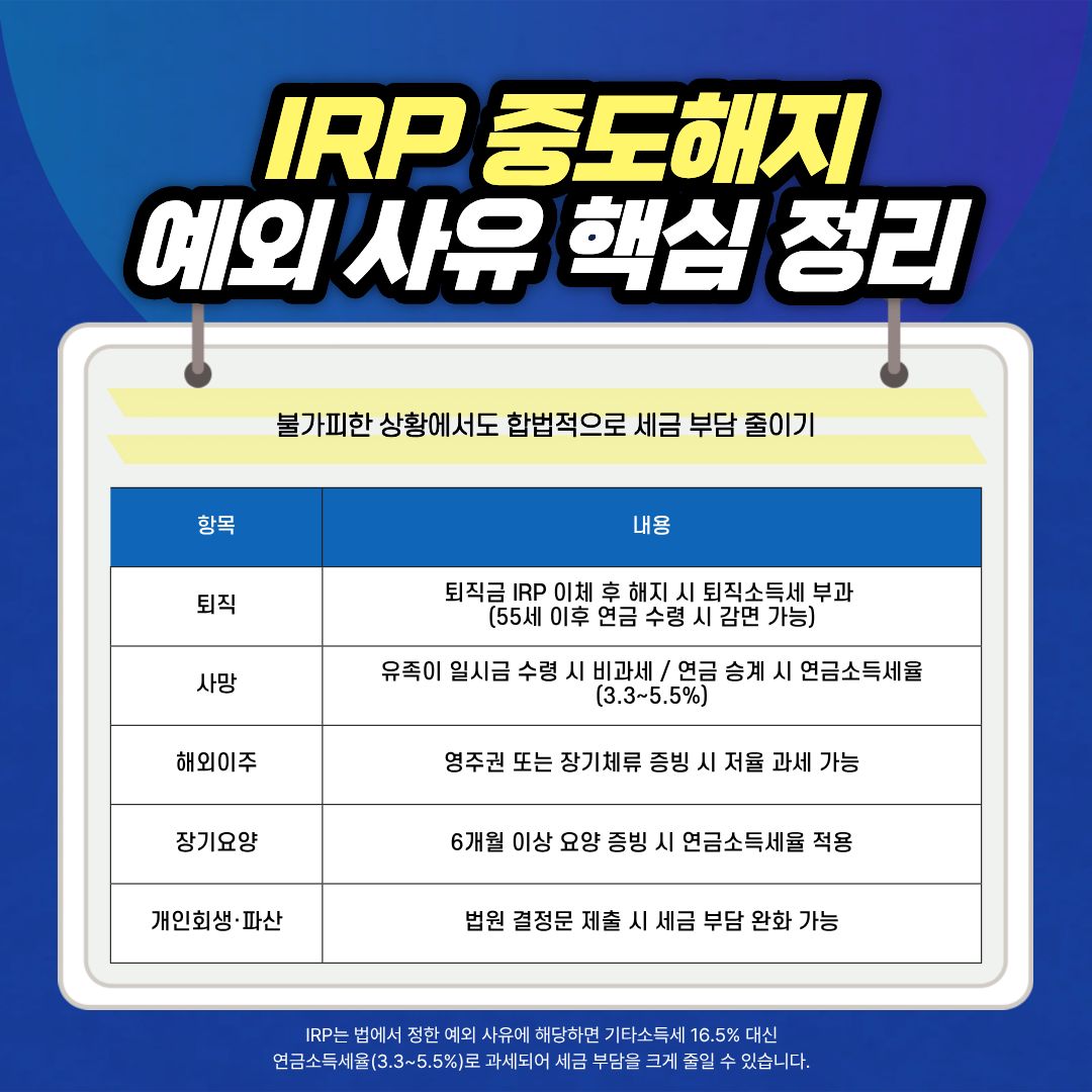 IRP 중도해지 시 무조건 세금폭탄이 부과되는 것은 아닙니다.