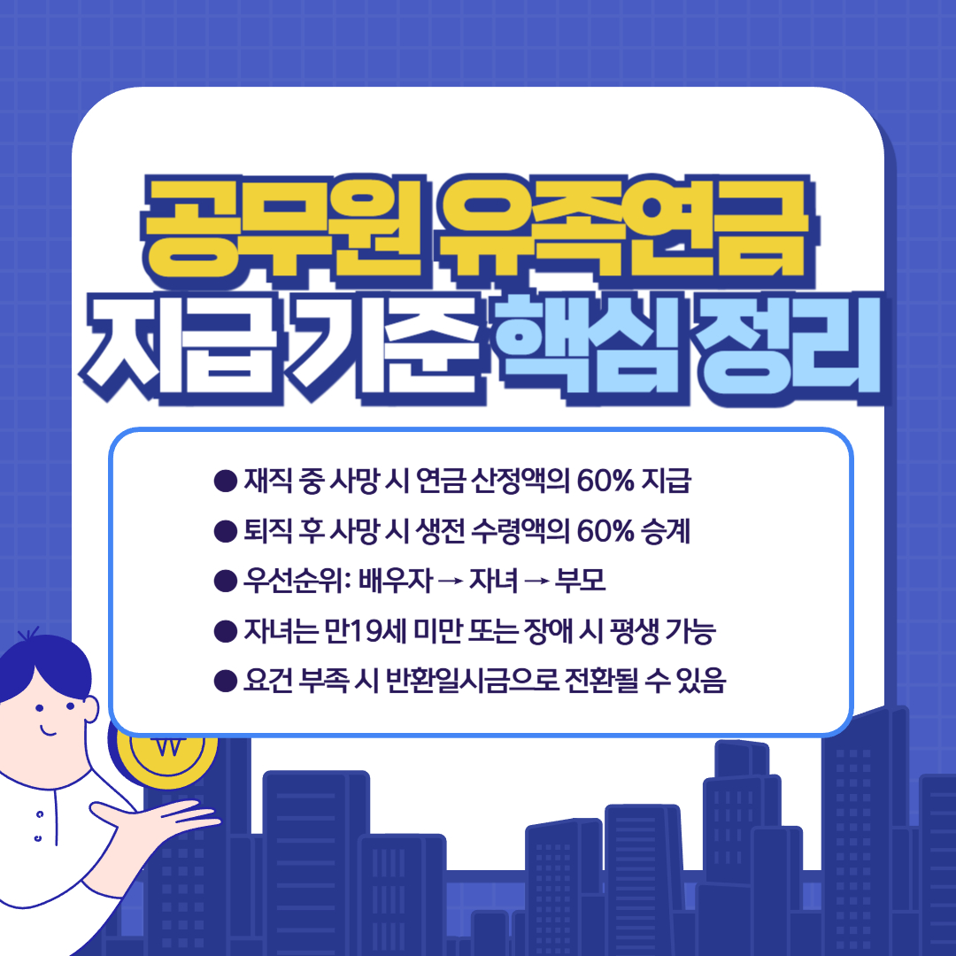 이 글에서는 2025년 기준 공무원 유족연금의 지급조건, 지급률, 유족 순위, 실제 받는 금액 구조까지 모두 정리했습니다.