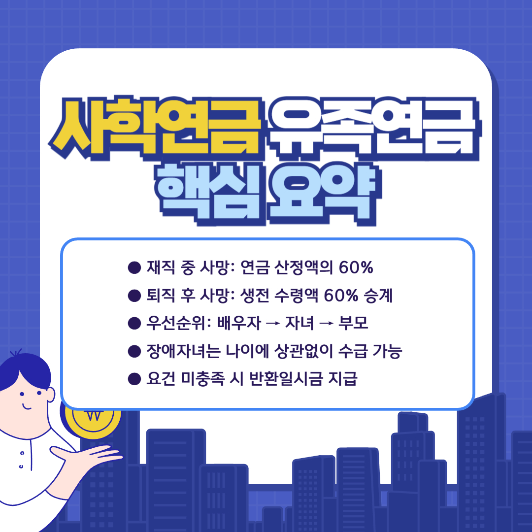 이번 글에서는 사학연금 유족연금의 지급 요건, 지급률, 유족 순위와 실제 계산 방식까지 모두 정리했습니다.