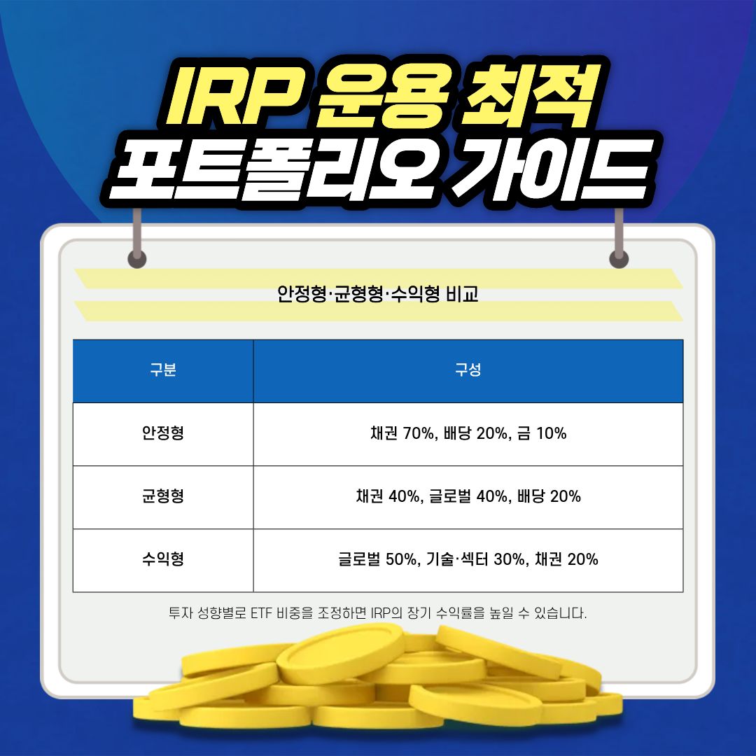 이번 글에서는 2025년 IRP ETF 추천 TOP5, 안정형·수익형 포트폴리오 구성법, IRP ETF 운용 팁까지 놓치지 않고 정리했습니다.