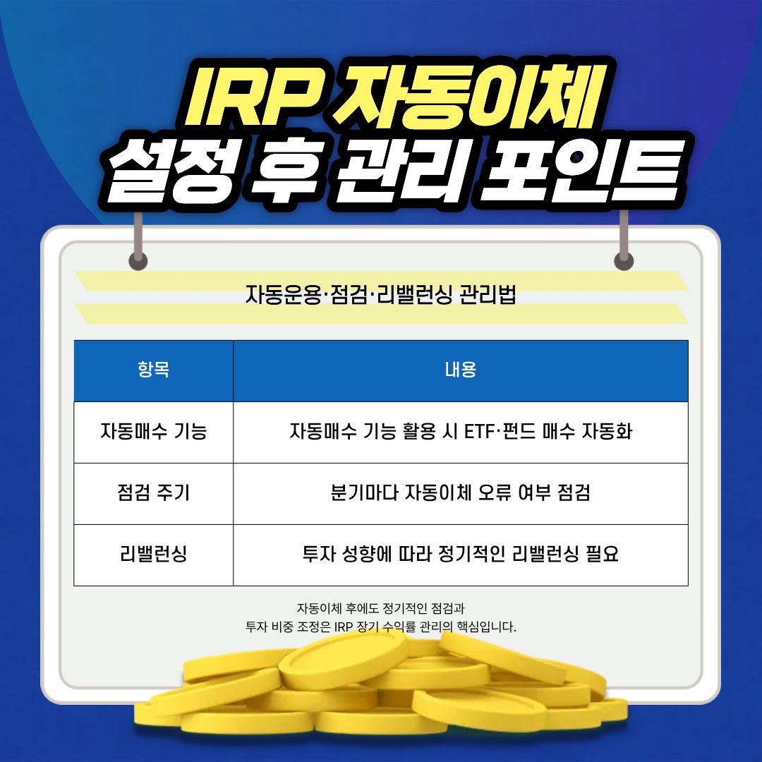 그래서 IRP 자동이체는 필수적인 관리 도구라고 할 수 있습니다.