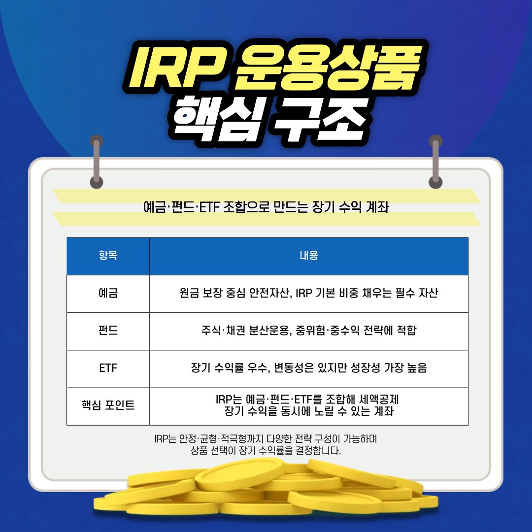 IRP는 세액공제 혜택뿐 아니라 장기 투자 계좌로 활용할 수 있어 운용상품 선택이 매우 중요합니다.