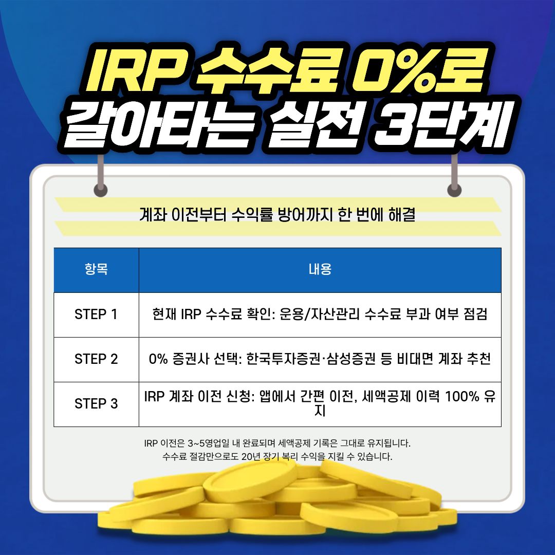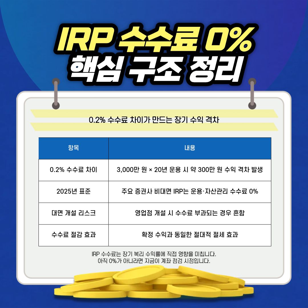 IRP는 우리의 노후를 책임질 장기 투자 상품인 만큼, 지금이라도 내 계좌의 수수료를 꼼꼼히 확인하고 '0% 수수료'라는 가장 기본적인 절세 혜택부터 확보하는 자세가 중요했습니다.