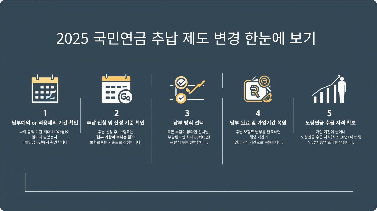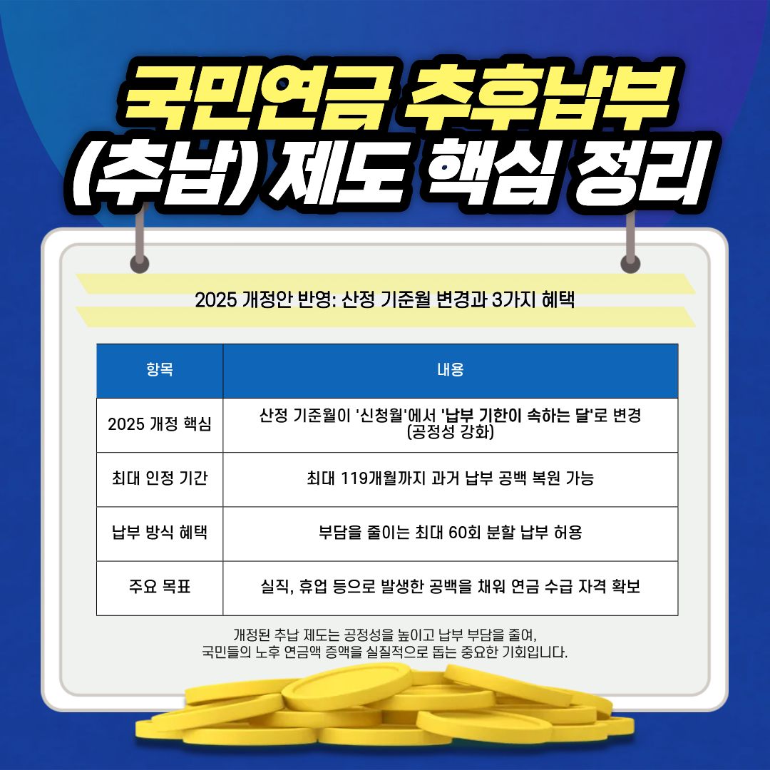 2025년 개정된 국민연금 추납 제도는 과거의 불공정성을 해소하고, 더 많은 국민들이 놓친 기간을 보완하여 든든한 노후를 설계할 수 있도록 설계되었습니다.