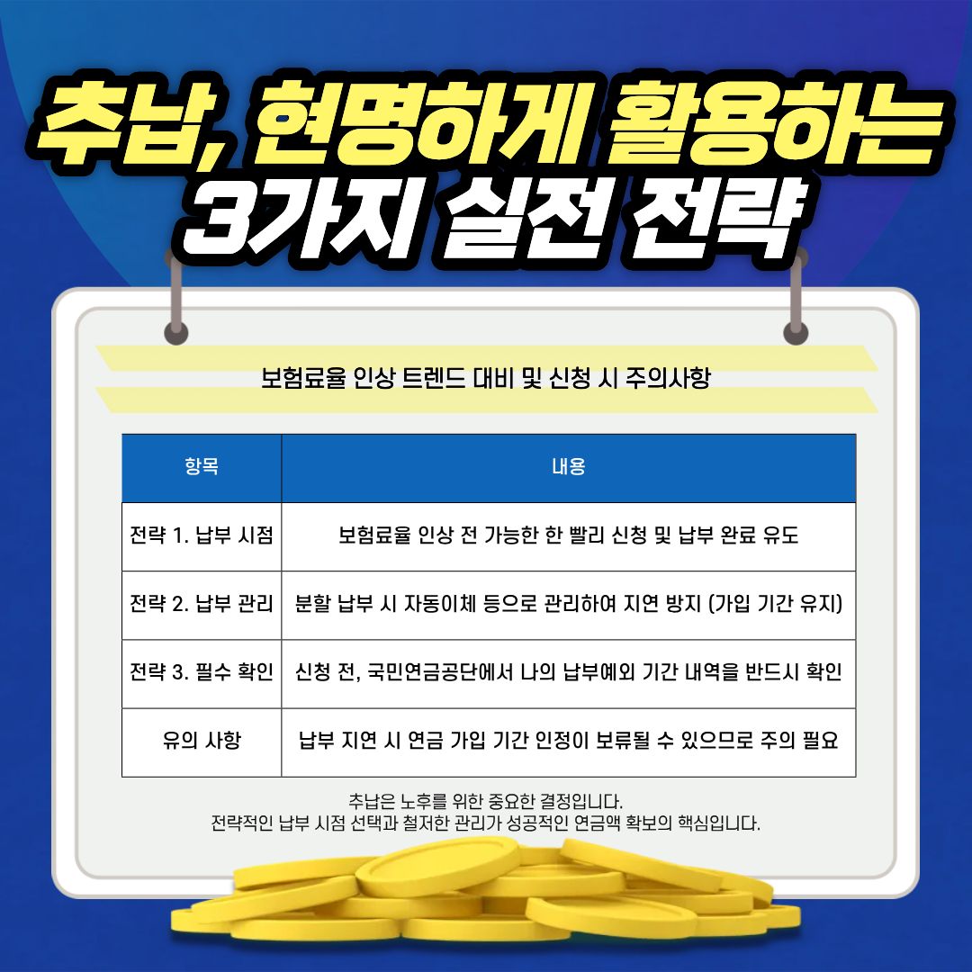 제도적인 안정성 측면에서 납부 시점이 중요해졌으므로, 보험료율 인상이 시행되기 전에 가능한 한 빨리 추납 신청과 납부를 완료하는 것이 경제적으로 더 유리할 수 있다는 점을 기억해야 합니다.
