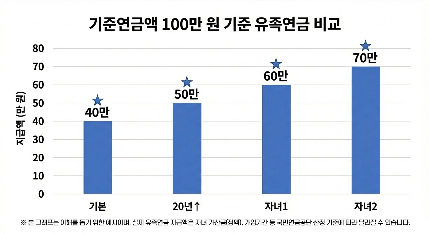 | 유족 중 자녀 (조건 충족 시) 존재 | 부양가족 가산액 지급 가능 | 미성년 자녀, 25세 미만 학생 자녀, 또는 일정 등급 이상의 장애 자녀가 있는 경우, 유족연금에 부양가족 가산액이 추가될 수 있습니다. |
