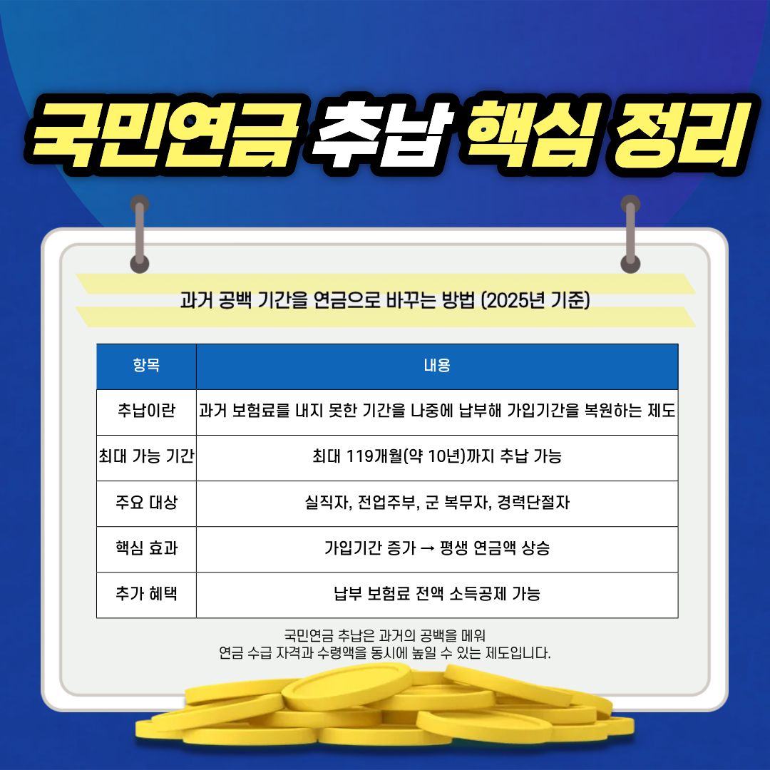 2025년 국민연금 추납 제도는 노후 준비의 골든타임을 놓친 분들에게 주어지는 마지막 기회와 같습니다.