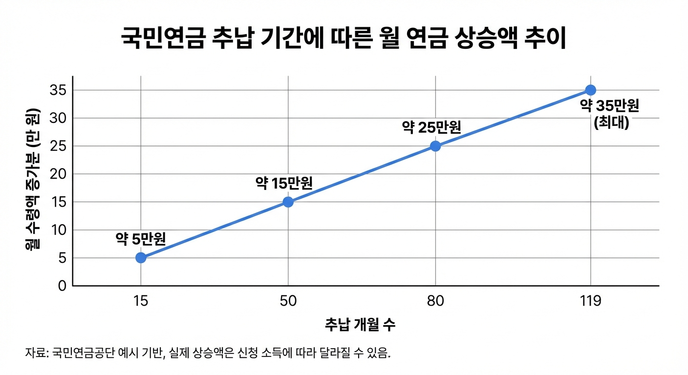 ● 연금 상승 효과: 추납 전 예상 연금 월 30만 원 → 추납 후 월 약 65만 원으로 상승.