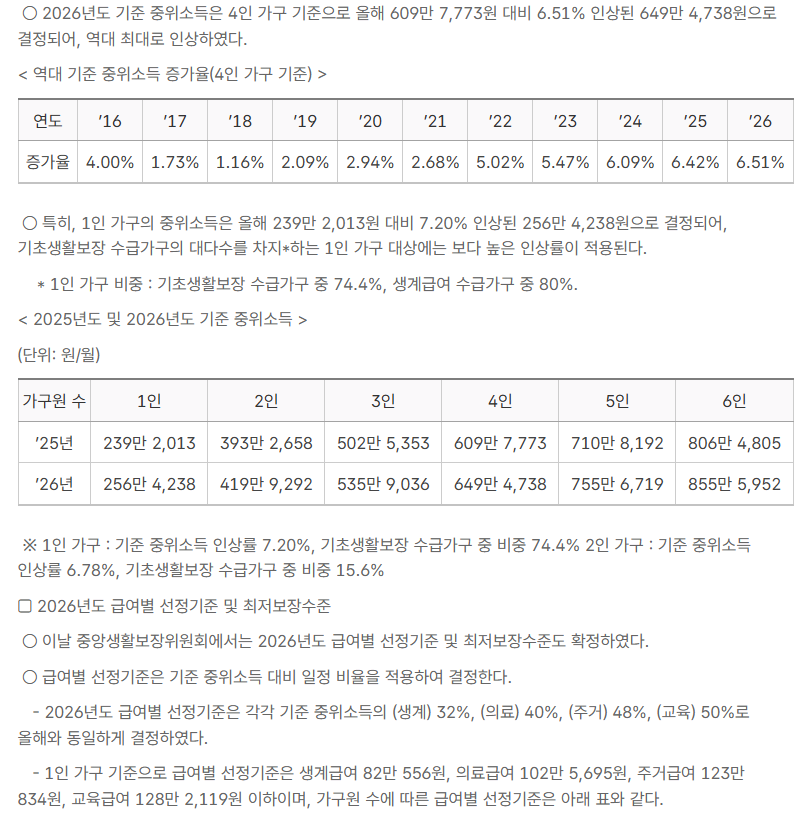 2026년도 기준 중위소득 6.51% 역대 최대로 인상 < 보도자료 < 알림 : 보건복지부 대표홈페이지